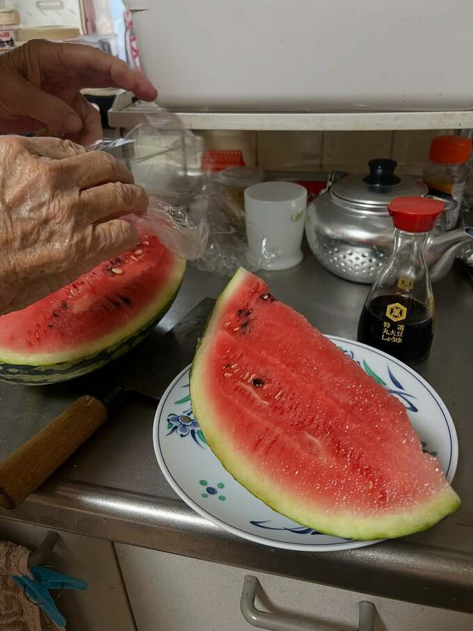「ばあちゃんちに行きました。庭で作ったスイカ」という写真には、小ぶりに育ったスイカが切られていて「あまい〜ばあちゃんって感じ」と和む感じがにじみ出ています。