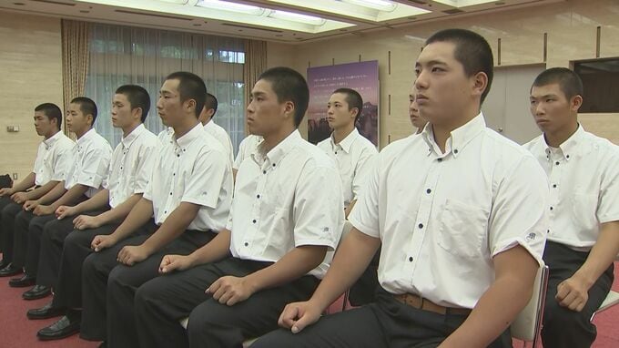別府市役所を訪れたのは明豊高校野球部の3年生や監督など16人で、長野恭紘市長に甲子園での戦いについて報告しました。