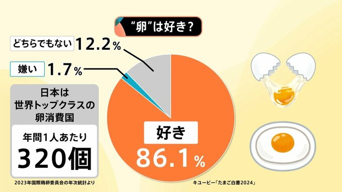 また、「卵は好き?」との問いに、日本人の約8割が“卵が好き”と答えています。
