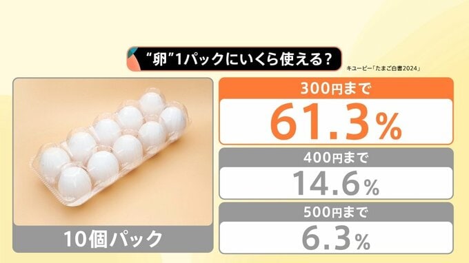 キユーピーの調査「たまご白書2024」によりますと、卵1パック(10個入り)に“300円まで払える”と答えた人が6割以上(61.3%)にのぼりました。