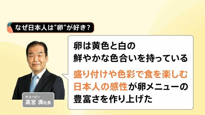 さらに、卵を年間42億個も使っている、キユーピーの髙宮満社長は「卵は黄色と白の鮮やかな色合いを持っている。盛り付けや色彩で食を楽しむ日本人の感性が、卵メニューの豊富さを作り上げた」のではないかと分析しています。