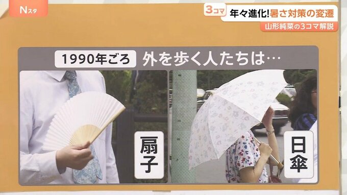 30年ほどさかのぼり、1990年ごろのニュース映像を見てみると、外を歩く人たちは扇子やうちわで扇いでいる方が多かったです。そして今では当たり前になりましたが、日傘を使って涼んでいる方もいました。