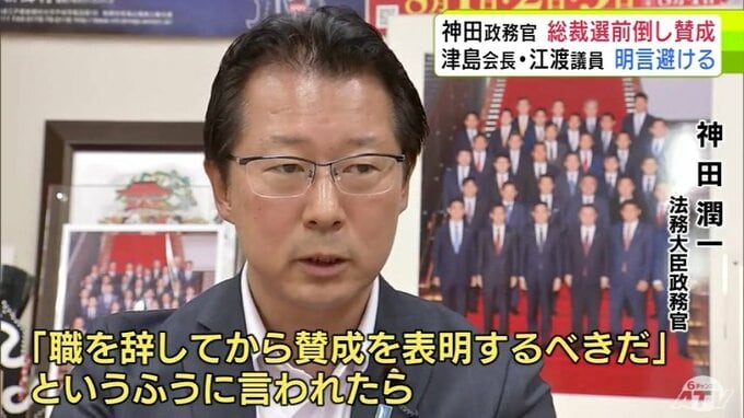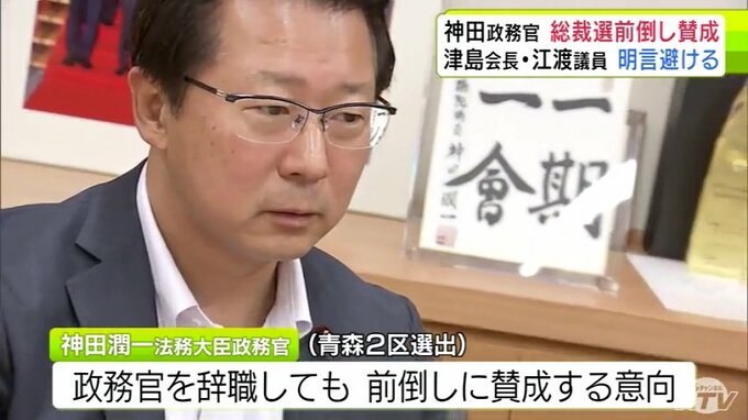 総裁選の前倒しは、国会議員295人と都道府県連の代表47人をあわせた342人のうち、過半数の要求で実施されます。青森2区選出の神田潤一 法務大臣政務官は28日、JNNの取材に対して政務官を辞職しても前倒しに賛成する意向であることを明らかにしました。