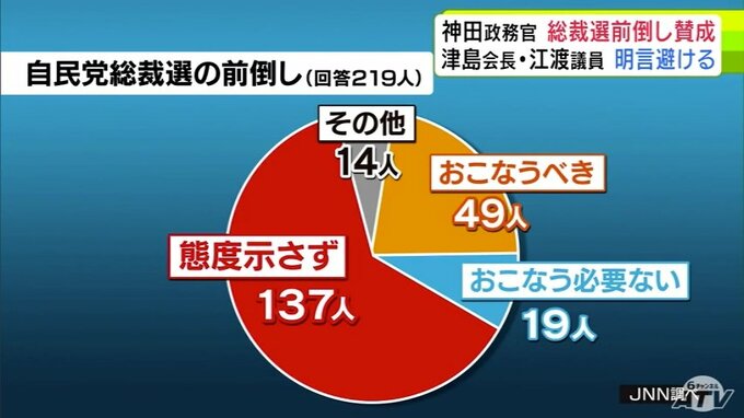 JNNが「総裁選の前倒し」をおこなうべきか自民党所属の国会議員295人にアンケートや直接聞き取りをしたところ、219人から回答を得ました。その結果、「おこなうべき」が49人、「必要はない」が19人で、約6割を占める137人が態度を示しませんでした。