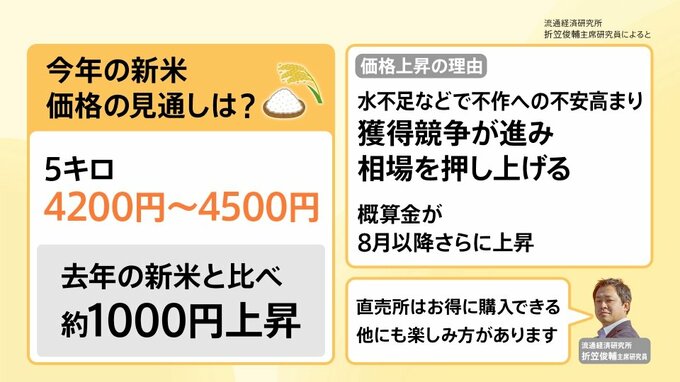 今年の新米価格の見通しは、5キロ4200~4500円。2024年の新米と比べ、約1000円上昇しています。