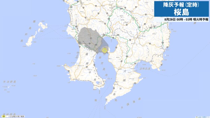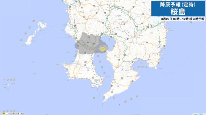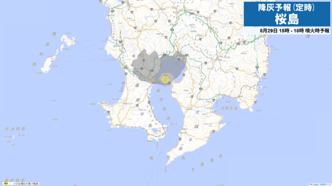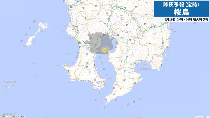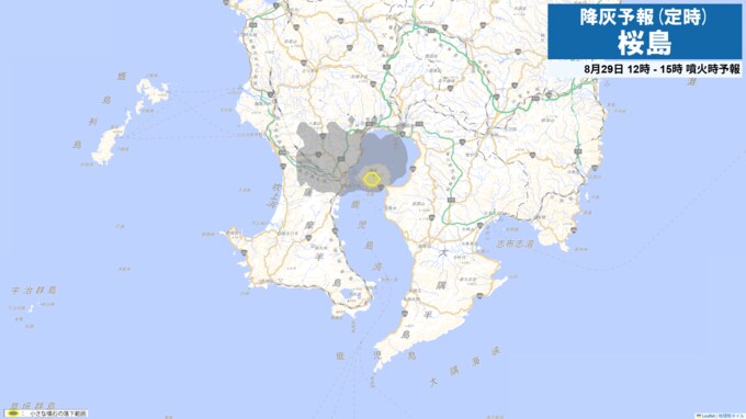 29日午前9時から正午までは火口から西の鹿児島市街地方向、北西の鹿児島市吉野方向に降灰が予想されます。
