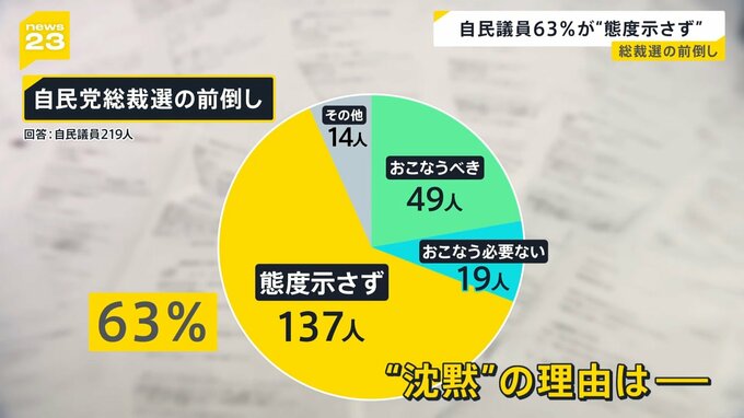 JNNは28日までに党所属の国会議員295人に、総裁選をおこなうべきか、アンケートや直接聞き取るなどの独自調査を実施し、219人から回答を得ました。