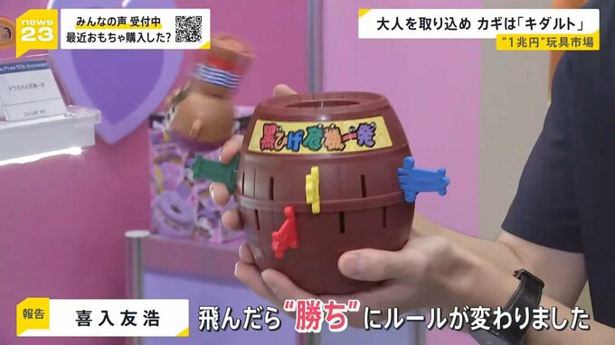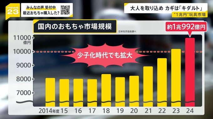 28日に開幕した「東京おもちゃショー」。実はいま、おもちゃ市場は少子化にもかかわらず、盛り上がりを見せています。2023年度には市場規模が初めて1兆円を突破。拡大が続くその理由とは…カギを握るのは「キダルト」です。