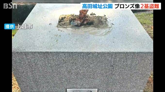 上越市の高田城址公園で28日、2つのブロンズ像が盗まれているのが見つかりました。盗まれたのは高田城址公園にある16のブロンズ像のうち2つです。28日午前8時半ごろ、上越市立歴史博物館の職員が盗まれているのに…