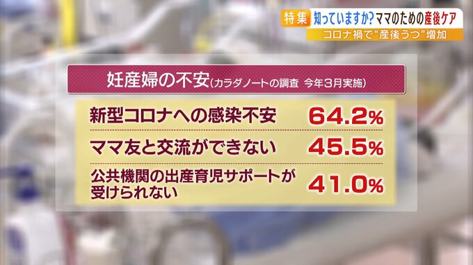 また今年3月に実施されたカラダノートの調査では、妊産婦の不安要因として「ママ友と交流ができない(45.5%)」「公共機関の出産育児サポートが受けられない(41.0%)」という結果も出ていて、コロナ禍での孤立化が懸念されています。