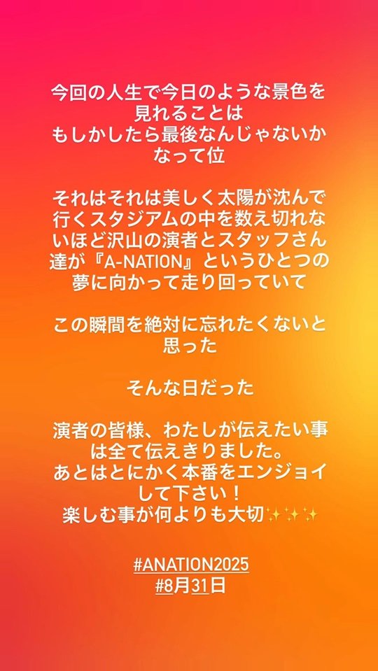 さらに「それはそれは美しく太陽が沈んで行くスタジアムの中を」「数え切れないほど沢山の演者とスタッフさん達が『A-NATION』というひとつの夢に向かって走り回っていて」「この瞬間を絶対に忘れたくないと思った」と、脳裏に光景が浮かび上がるほどの言葉を尽くして、感銘を受けた情景を描写。