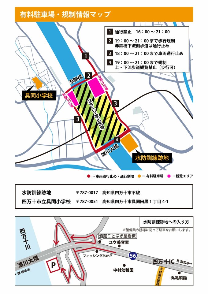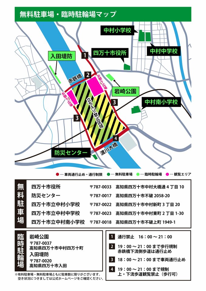 混雑緩和、安全確保のため、会場周辺では交通規制が予定されています。詳しくは四万十市観光協会ホームページをご覧ください。