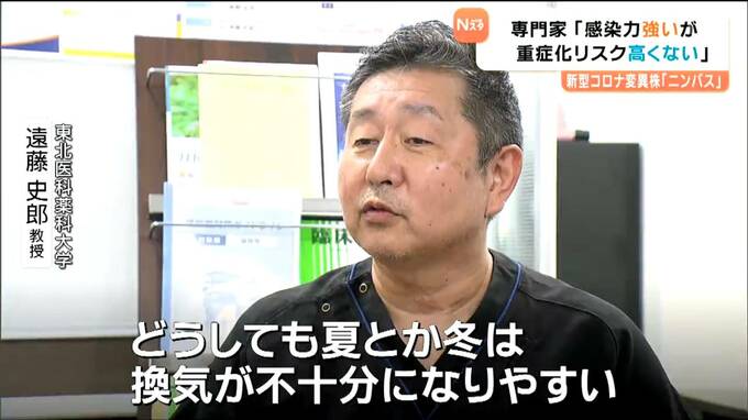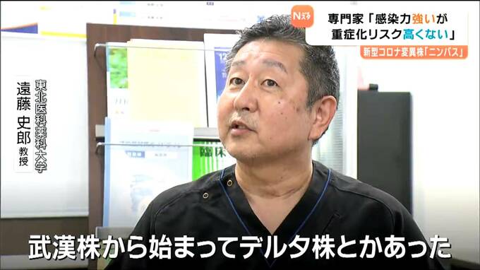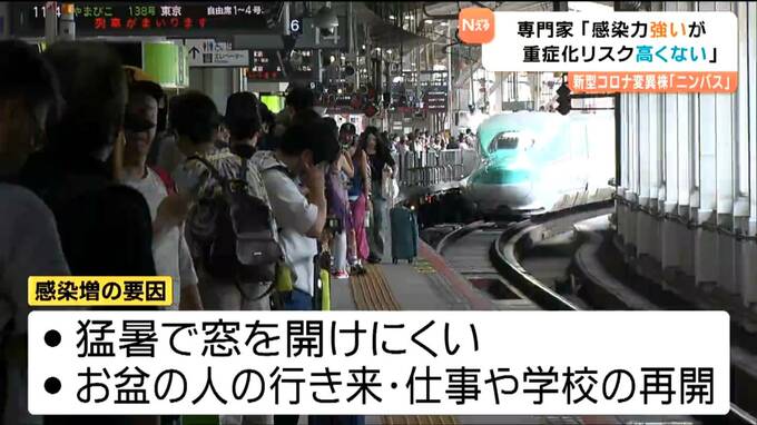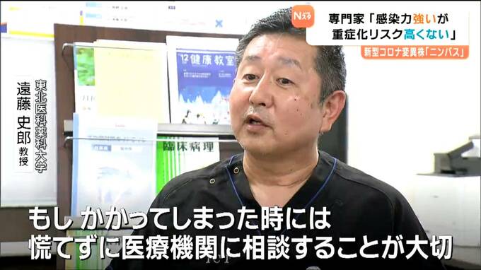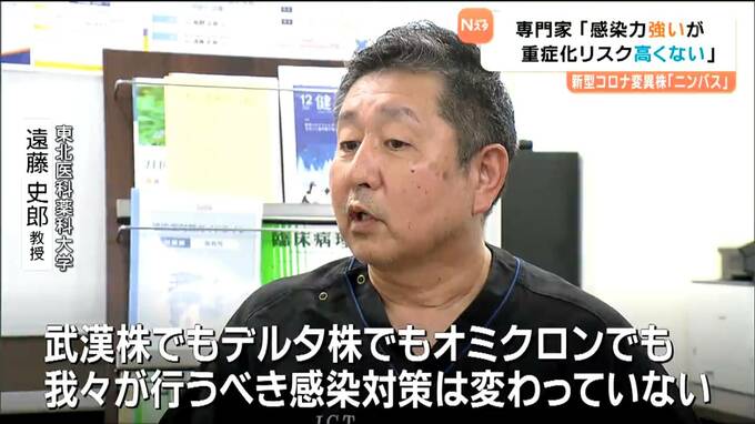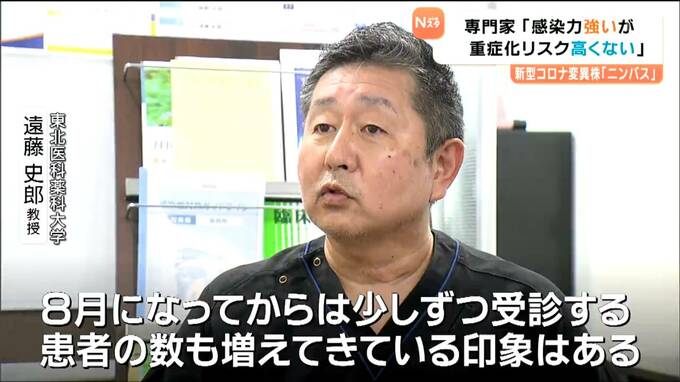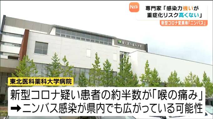 お盆期間が明け、宮城県内でも新型コロナの感染者数が急激に増加する中、激しいのどの痛みが特徴の新たな変異株「ニンバス」の感染が、県内でも広がっているとみられます。専門家は「感染性は強いものの重症化のリスクは高くなっておらず、これまで通り基本的な感染対策をすることが大切」と話しています。