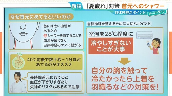 自律神経は室内外の気温差が大きいと酷使されてしまうので、室温を冷やしすぎず28℃程度に保ち、自分の腕を触って冷たかったら上着を羽織るなどの対策をとるのも大事です。