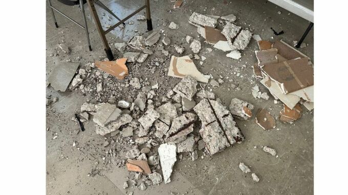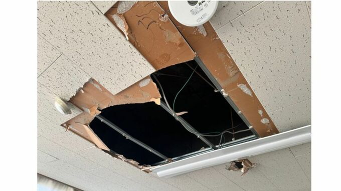落下したのは約20センチ×約30センチの大きさで、重さ約20キロのコンクリート片3個など複数の破片です。天井裏の躰体の老朽化で一部が破損し、天井部材の一部を突き破って落下したものとみられています。無人の時間に落下したため、けがをした人はいませんでした。