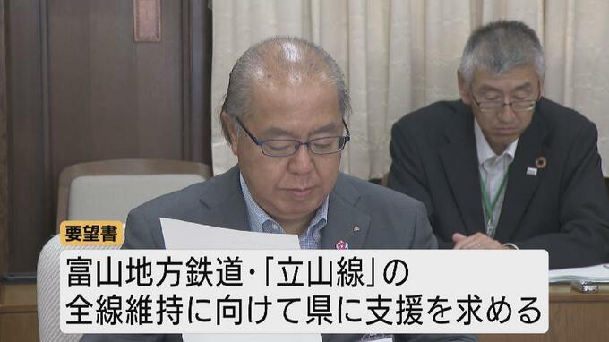 要望書では、一部区間で廃止が議論されている富山地方鉄道「立山線」の全線維持に向けて県に支援を求めました。