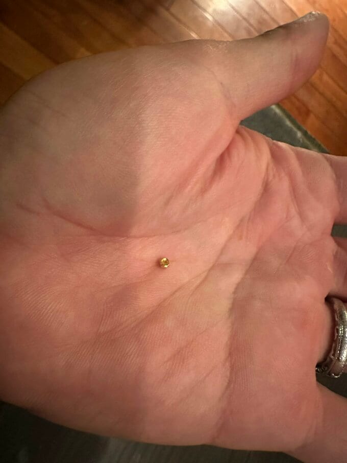 投稿された画像には、つるのさんの手のひらに載せられた小さな金色のナット状の物体が写っています。