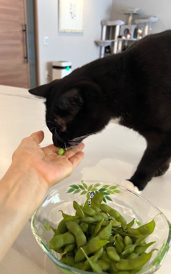 藤さんは「こんだけ暑いと食欲も落ちそうですが枝豆パワーで打ち勝つぞ」と気合いを入れていて「マル坊もお気に入りでーす」と、マルの鼻先に枝豆を持っていっています。