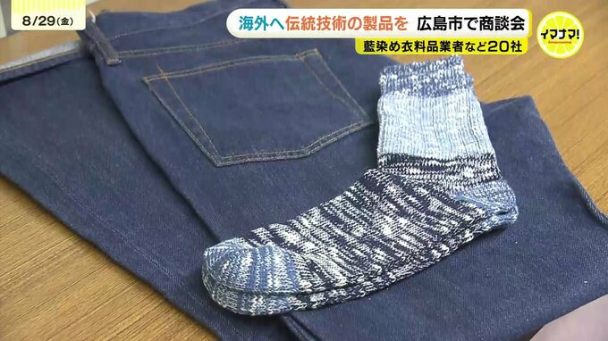 この商談会は、ジェトロ=日本貿易振興機構が開いたもので、中国地方の20社が参加。アメリカや香港などの5社からバイヤーが招かれました。藍染めの技法を使った衣料品などを手がける福山市の「藍屋テロワール」は、アメリカのキッチン用品専門店と商談を行いました。