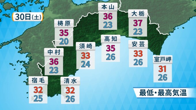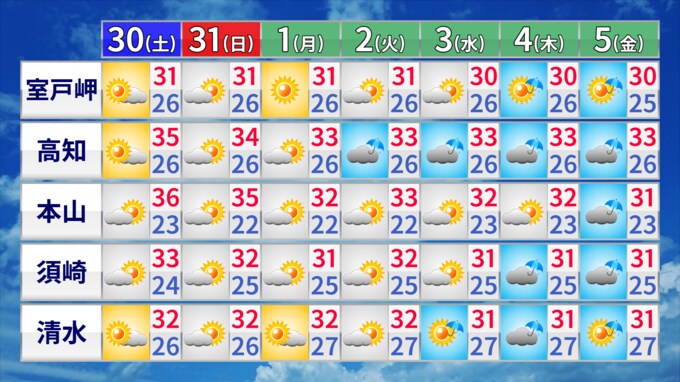 朝の最低気温は、山沿いでは涼しさを感じられるところもありそうです。日中の最高気温は、高知市をはじめ、平野部・山沿いともに35度以上の猛暑日となるところがあるでしょう。熱中症対策を忘れずに行うようにしてください。