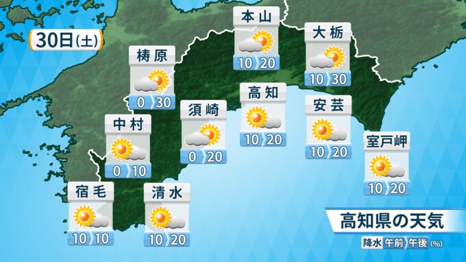 30日の高知県内は、高気圧に覆われて概ね晴れますが、昼過ぎから夕方は湿った空気や日射の影響で雨の降るところがあるでしょう。