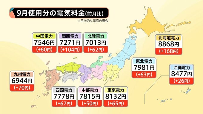 例えば北海道電力は、8月と比べて+168円、東京電力でも+65円となります。