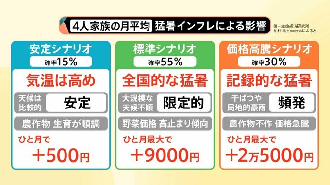 この夏は、非常に厳しい暑さが続きました。実は6月末の時点で、AIに気象データや農作物の価格の見通しを学習させて、どれぐらい家計の負担が増えていくのかという試算を出していました。それぞれのシナリオを見ていきたいと思います。