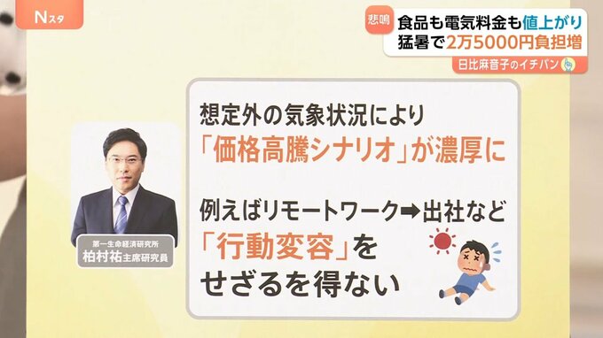 第一生命経済研究所の柏村祐主席研究員は「想定外の気象状況により、『価格高騰シナリオ』が濃厚になっている」とし、「例えばリモートワークを出社に変えて、クールシェアリングして冷房などを使わずに、家の電気料金を抑えていくというような、『行動変容』をせざるを得ないのではないか」ということです。