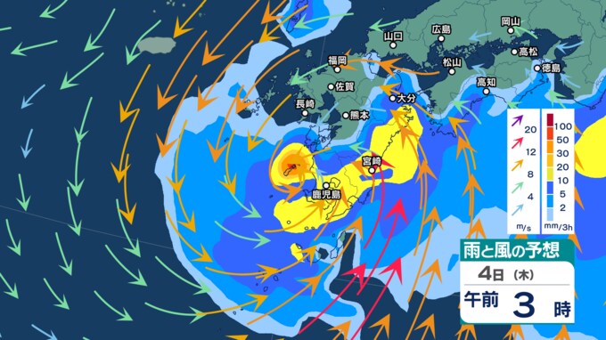 また、最新の「5日先までの雨と風の予想シミュレーション」を見てみると、このほかに、日本の南から台風のように「反時計回り」に渦を巻く雨雲と風のかたまりが徐々に北上しています。この渦は9月4日(木)にかけて九州付近に接近する様子が見てとれます。