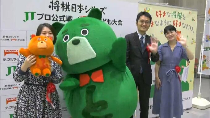 将棋日本シリーズJTプロ公式戦の新キャラクター「あなぐまーと」と棋士がお出迎え。