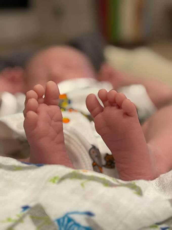 ジュニアさんは「2025年夏、第三子が誕生しました!」と報告。生まれたばかりの赤ちゃんの両足の裏をしっかりと正面で捉えた写真を投稿しています。