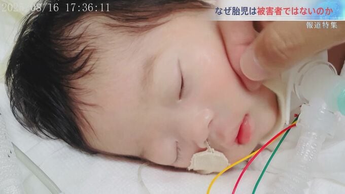 喉に管が繋がれた日七未ちゃん。人工呼吸器がなければ呼吸することもできない。友太さんは、胎児が被害者と認められないことは、到底納得はできないと憤る。