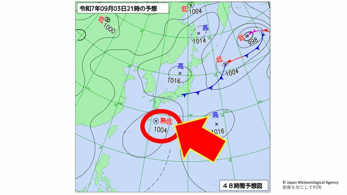 一方、9月3日の夜には沖縄の東で熱帯低気圧(熱帯じょう乱)が発生する見込みです。