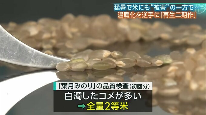そして迎えた早場米の収穫。「葉月みのり」の品質検査では、白く濁ったコメの比率が高く、初回分は全て「2等米」という結果に。