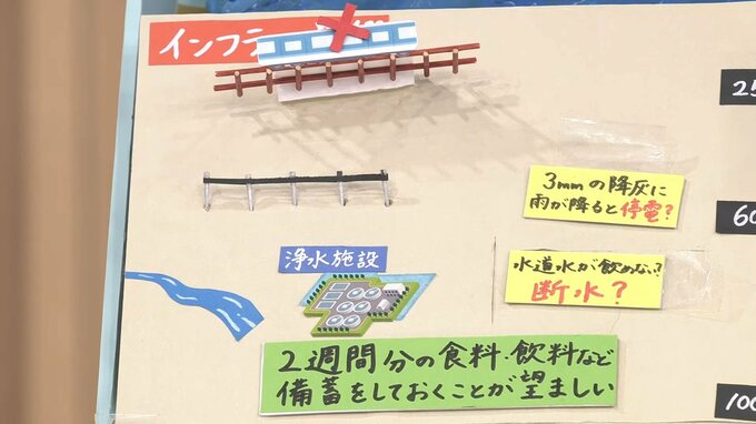 その他のインフラへの影響ですが、電線にわずか3ミリでも火山灰が積もったところに雨が降ると、停電が発生する可能性があり、大量の火山灰で河川などの水質が悪化し浄水施設の処理能力を超えると、水道水が飲めなくなったり断水したりする恐れもあります。