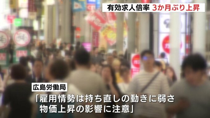 広島労働局では「雇用情勢は求人が求職を上回って推移しているが、持ち直しの動きに弱さがみられる。物価上昇などが与える影響に注意する必要がある」としています。