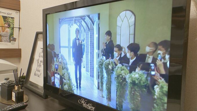 式場の扉が開き、緊張からかタキシード姿でたどたどしく入場する新郎を見て、自宅内には2人の明るい笑い声が飛び交う。