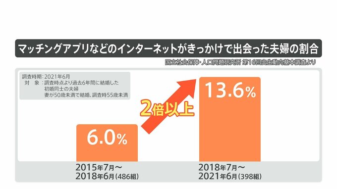 国立社会保障・人口問題研究所の調査(第16回出生動向基本調査)では、2018年7月~2021年6月までの3年間に初婚同士で結婚した夫婦のうち、実に13.6%が出会いのきっかけが「マッチングアプリ」などのインターネットのサービスと回答。それ以前の3年間(2015年7月~2018年6月)の6.0%から2倍以上と、急増している。