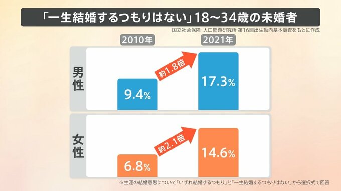 国立社会保障・人口問題研究所の調査(第16回出生動向基本調査)では、2021年6月、18歳~34歳の未婚の男女を対象に結婚に関する意識調査を行った。その中で、「一生結婚するつもりはない」と答えた人は男性で17.3%、女性で14.6%に上り、男女ともに過去最多を更新している。