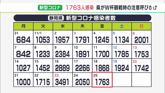 11月25日、静岡県内では、新たに1763人が新型コロナウイルスに感染したことがわかりました。1週間単位の新規感染者数は、依然として増加傾向にあります。