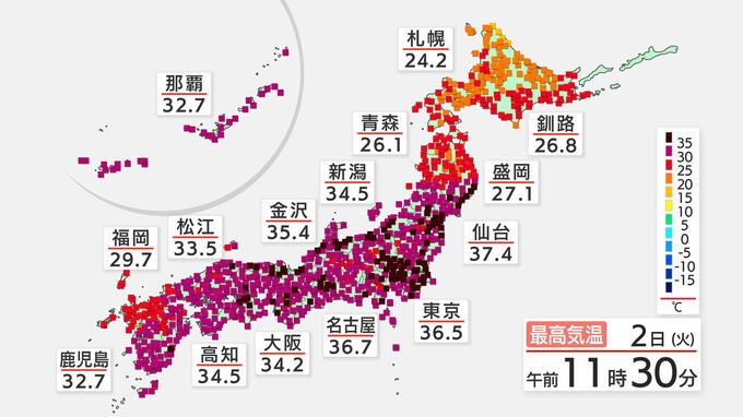 仙台では先ほど午前11時28分に気温が37.4度まで上がり、1926年の観測開始以来一番の暑さとなりました。これまでの最高記録は2018年8月1日の37.3度でした。