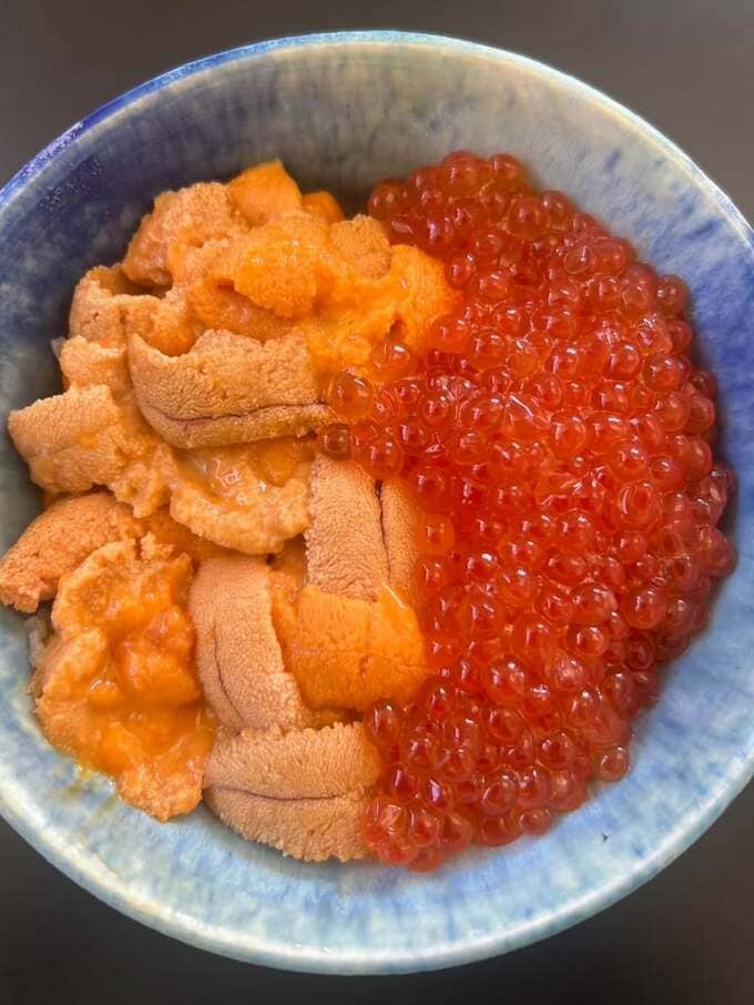 丼の左半分には鮮やかなオレンジ色のウニがたっぷりと盛りつけられ、右半分には艶やかな赤いイクラが詰め込まれています。イクラの透明感とウニのクリーミーさが見事に調和した、シンプルながらも豪華さが際立つ一品となっています。