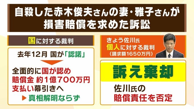 ーー妻・雅子さんが損害賠償を求めていた裁判では、去年の12月に国が認諾、つまり全面的に国が認め、賠償金約1億700万円を支払い、幕引きとなりました。赤木さんの訴えを国側が認め、裁判が強制的に終わり、真相解明にはなりませんでした。一方で佐川氏には1650万円の賠償を求めていましたが、11月25日の判決で佐川氏の賠償責任を否定し、請求は棄却となりました。率直に判決をどのように受け止めていますか?