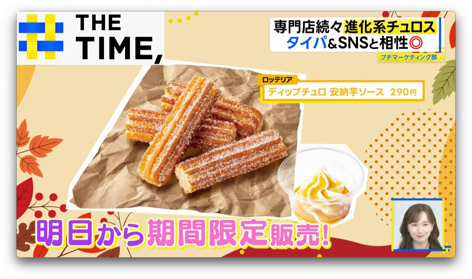 『ロッテリア』でもレギュラーメニューに加えて、9月3日から「ディップチュロ 安納芋ソース」(4本:290円)を期間限定で販売するなどチェーン店でも広がりを見せています。
