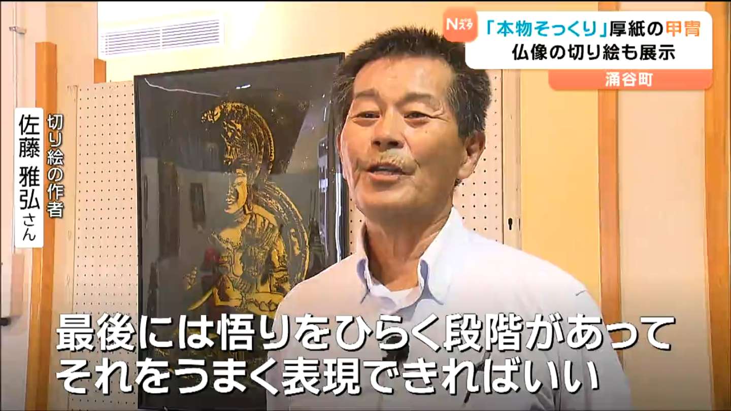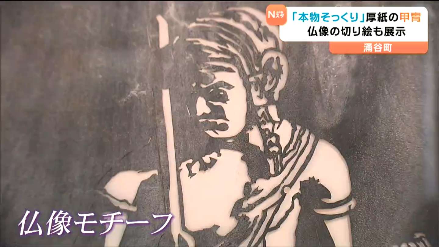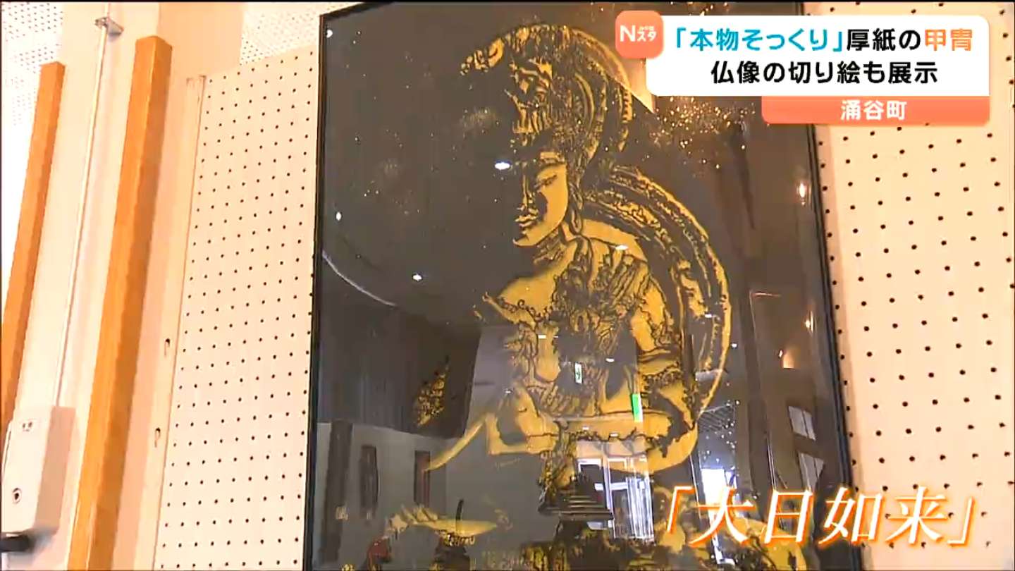 厚紙で手作りした甲冑や仏像をモチーフにした切り絵の展示会が宮城県涌谷町で開かれています。