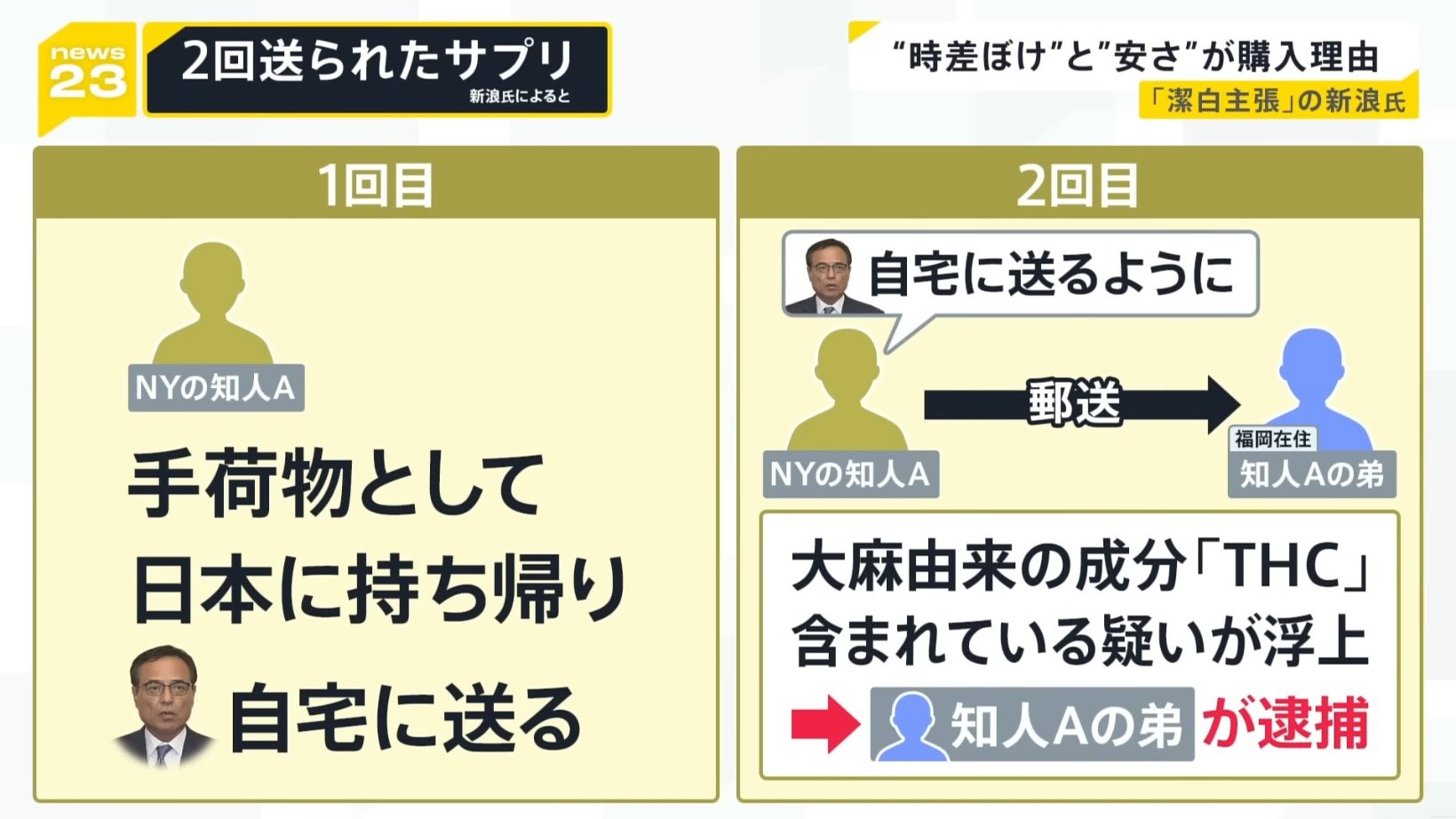 さらに8月、知人が福岡に住む弟に郵送し、新浪氏の自宅に送るよう依頼したといいます。ただ、この2回目の郵送分について、大麻由来の成分「THC」が含まれている疑いが浮上し、知人の弟が警察に逮捕されたということです。