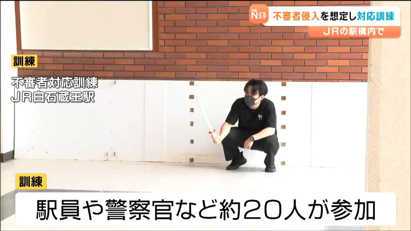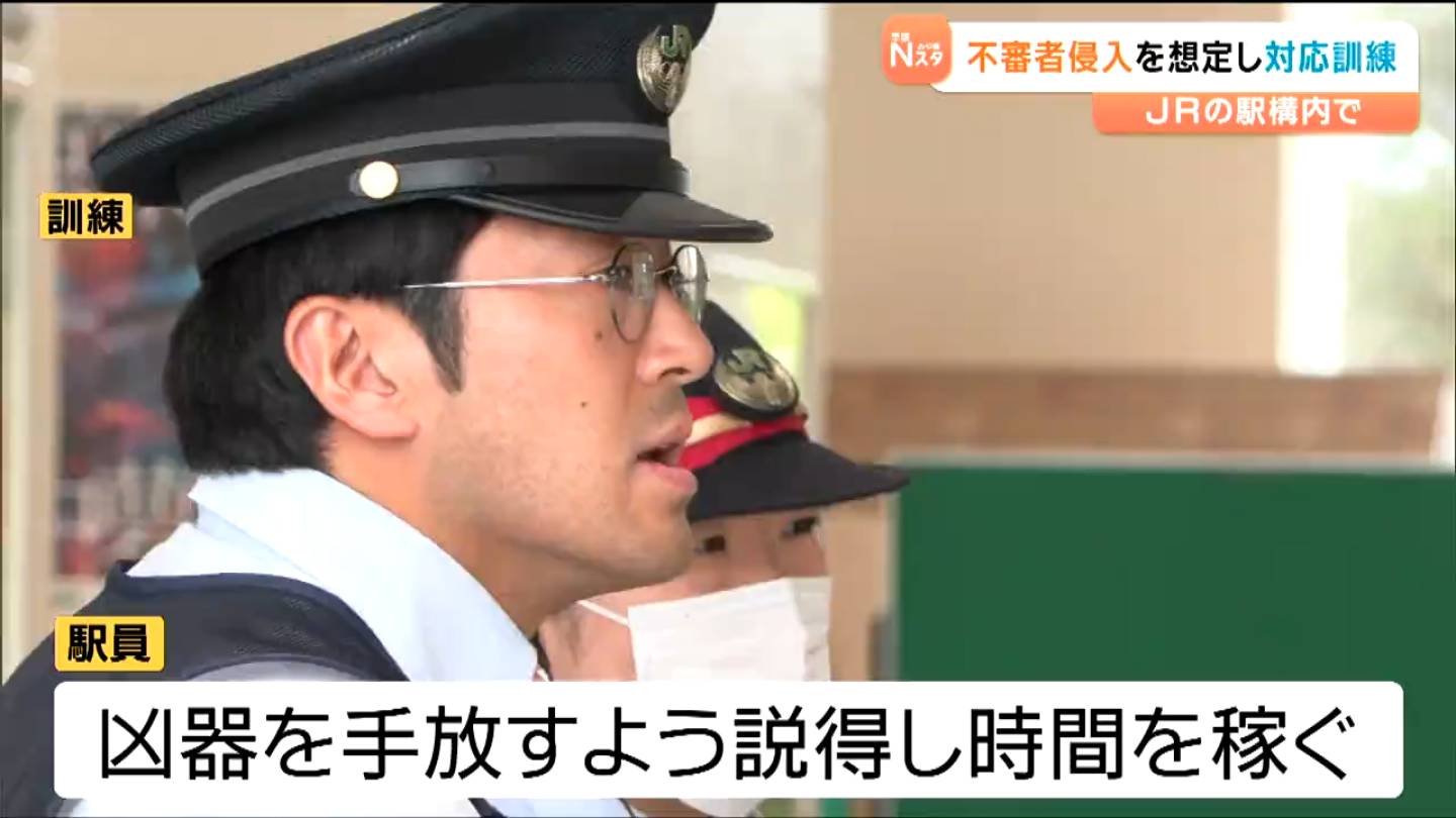 訓練では、駅構内にナイフを持っている不審者がいるという想定で通報を受けた駅員らが非常通報装置で警察に連絡し、不審者を刺激しないよう気を付けながら凶器を手放すよう説得し時間を稼ぎます。