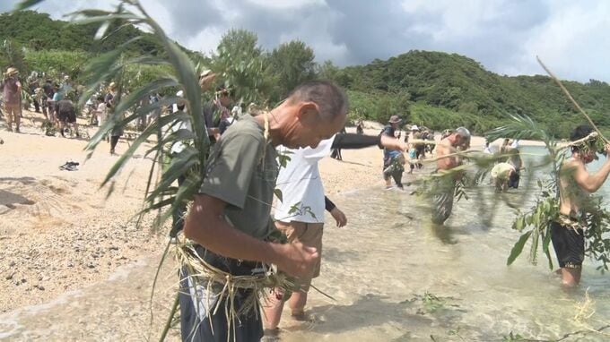 山を下りた男性たちは女性を木の枝で軽く叩いてお祓いし、その後、集落の浜で山の神と海の神に感謝を捧げると、集めた厄を地域の海に落としました。