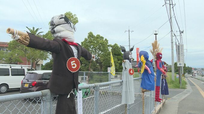 昔ながらのものから映画のキャラクターをイメージしたものまで…宇部市東岐波の国道190号沿いに15体のかかしがずらりと並んでいます。