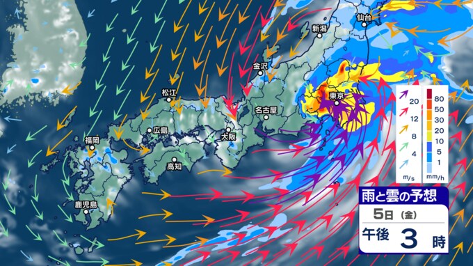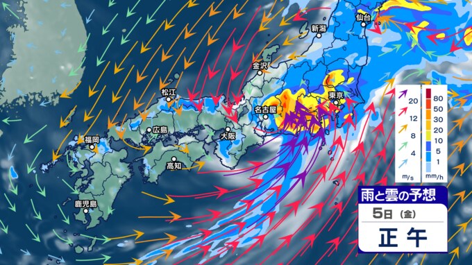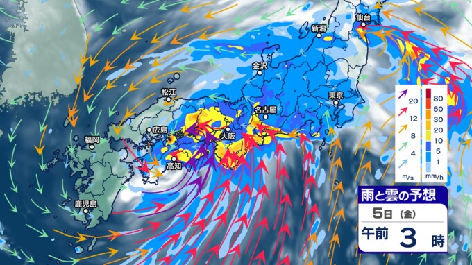 西日本から東日本では、5日にかけて、土砂災害、低い土地の浸水、河川の増水や氾濫に厳重に警戒してください。また、強風や高波、落雷、竜巻などの激しい突風に注意してください。発達した積乱雲の近づく兆しがある場合には、建物内に移動するなど、安全確保に努めてください。
